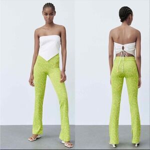 Zara Flared Jacquard Print Knit Pull On Pants Lime Green Yellow