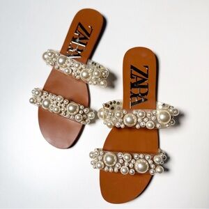 Elegant Zara sandals with pearl embellishments. Brown base with white pearl details. Perfect for stylish outings.