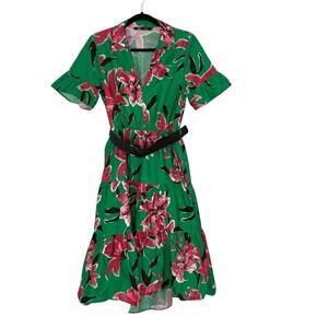Zara Floral A Line Dress Belted Tiered Kelly Green Pink Colorful Dopamine Size L