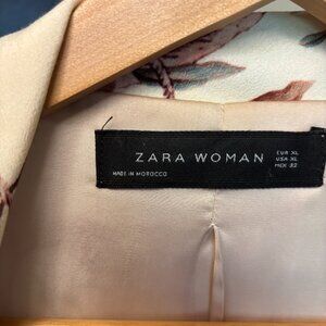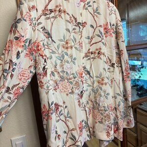 Elegant floral blazer with a soft cream base. Features pink and green floral patterns. Perfect for a stylish look.
