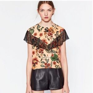 Floral blouse with vibrant patterns. Features black lace detail. Perfect for a chic look.