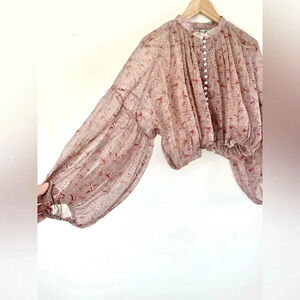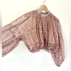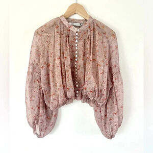 Elegant Zara blouse with floral pattern. Features button detail. Soft pink and cream tones. Perfect for casual or formal wear.