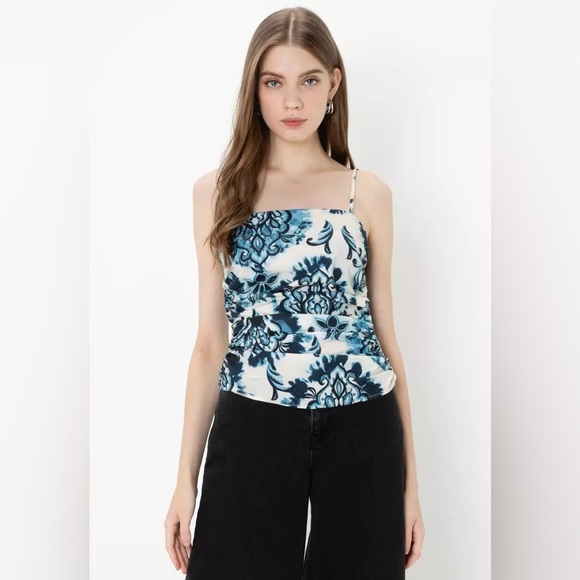 Zara Floral Blue and White gathered ruched Top size xs