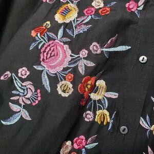 Black lightweight button front top, high low hem. Embroidered boho flowers on the front and back. Long sleeve with optional roll tab sleeves. Oversized fit.