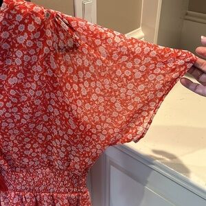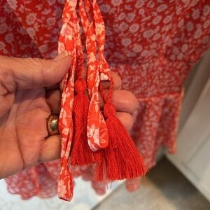 Zara Floral Mini Dress. V neck with fabric bow and tassels. Short sleeves. Wide smocked elastic waist. Red with white floral pattern. Lined. Size Medium