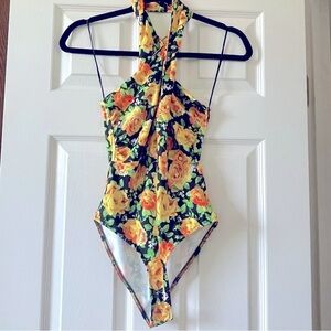 Zara floral bodysuit,yellow roses print pattern, multi-color, twists halter neckline, sleeveless, partially open back, snap closure at the button, stretchy fabric. Excellent condition, new without tags.