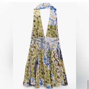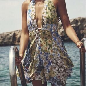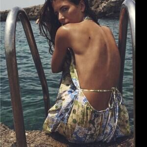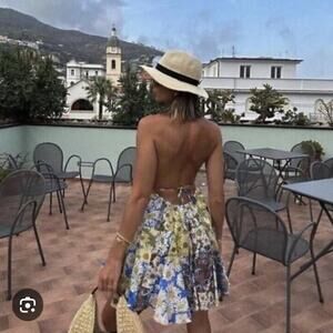 Vibrant floral halter dress paired with a stylish straw bag. Perfect for a sunny day out.