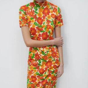 Think Spring! That certainly must have been what was on the mind of the fresh folks at Zara when they designed this dress. The vibrant orange and green multicolored florals will liven up your closet. And the oranges? They bring a bit of citrus retro to the party. This one is beautiful in person.