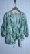 Elegant linen blend kimono wrap top has 3/4 length, puffed sleeves and a semi-cropped length when tied. Described as an oversized, featuring a green and white floral pattern, a V-neckline.