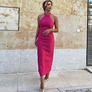 Zara Floral Lace Halter Midi Sheath Dress Pink Medium Open Back