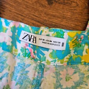 This is a pair of Floral print flared trousers by Zara. They are blue with pink, yellow, and green print. These pants have a clasp closure at the fly, and pockets on each side and the back. The materials tag is missing but per the website, these are a linen blend.