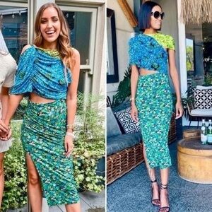 Rare Zara Floral Midi Dress Stretch Asymmetrical Blue Green Print Blogger Fave Size Medium