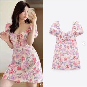 This Zara dress features a beautiful floral pattern with shades of pink and purple on a light background. It has a flattering off-shoulder design with puff sleeves and a lace-up front detail, adding a touch of elegance and femininity. Perfect for summer outings and casual events.