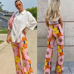 Zara Floral Print Flare Pants Sz.S Pink High Rise Viscose Dopamine Blogger Fav