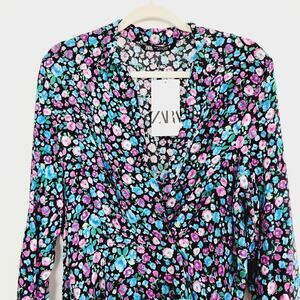 Zara Satin Effect Print Dress Floral Print V-Neck Faux Wrap Mini Dress Long Sleeve Side Hidden Zip Closure
