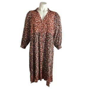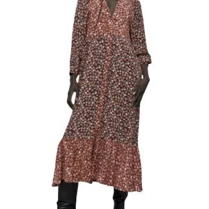 Zara Floral Printed Midi Mixed Pattern Balloon Sleeve Shirt Dress very flowy, mix floral pattern, front shirt, dress, collared, V-neck, balloon sleeves, covered buttons, side pockets, three-quarter sleeves, button cuffs.