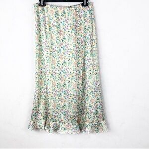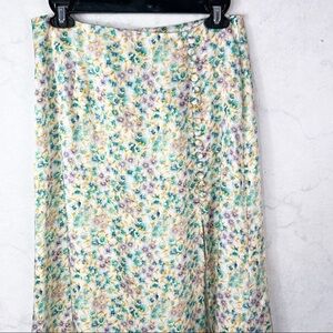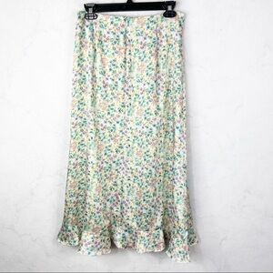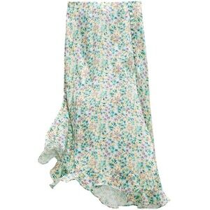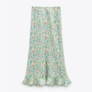 Zara Floral Printed Satin Midi Skirt. Front Slit. Button Details. Back Zipper Closure. Ruffle Hem Detail. Floral Allover Print - Blue Green Yellow Purple . Cute & Comfy. Loose & Lightweight. NWT / New with Tags. Great Condition. No Stains or Rips.