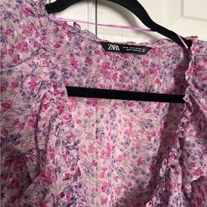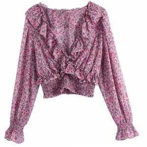 Chic Zara blouse with floral pattern. Features ruffle details and long sleeves. Perfect for stylish outings. Cropped styling.
