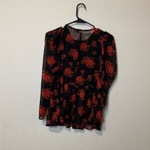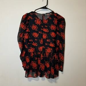 Zara, semi-sheer, puff sleeves, floral, black and red, chiffon, Romantic blouse, Peplum shirt, Lightweight blouse, Boho