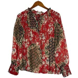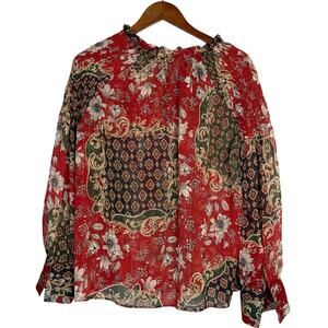 Zara Floral Sheer Long Sleeve Flowy Chiffon Boho Patch Work Blouse Smocked Ruffle Button Tie Neck Shimmery XL Red Green White Cream