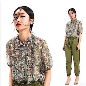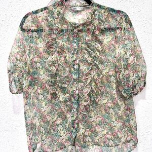 Elegant sheer blouse with floral design. Ideal for a stylish outfit.