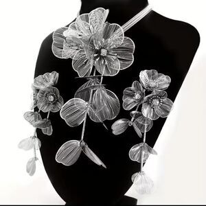 Elevate your style with this stunning silver-plated floral necklace and earrings set. Inspired by the beauty of nature, this handcrafted set features intricate flower and petal designs that exude elegance and sophistication. The wirework detailing in the flowers adds a unique, sculptural dimension, making it a statement piece for any occasion.