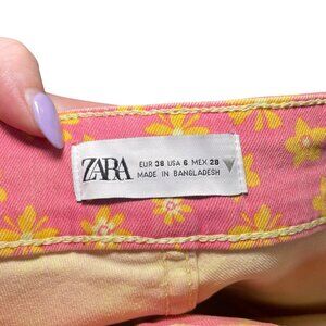 Zara Floral Straight Leg Ankle Jeans Coral Pink Yellow Flowers Size 6