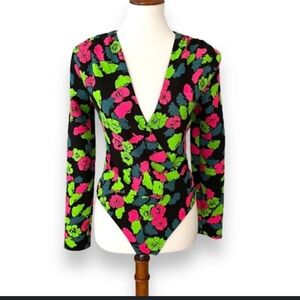 Stylish floral bodysuit with a V-neck design. Features bold pink and green patterns on a black base. Perfect for pairing with jeans or skirts.
