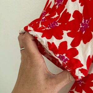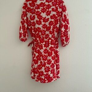 Mini dress with V neckline Elastic waist, attached belt 3/4 sleeves