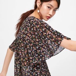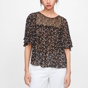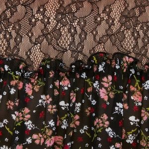 NWT. Flowy round neck top with short full sleeves. Tonal lace appliqué at chest. Back opening and button closure.