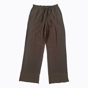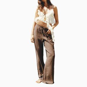 Float through your day in comfort and style with these chic Zara flowy pants. These high-rise pants feature an adjustable elastic drawstring waistband for an easy pull-on design and ultimate comfort. Crafted from a lightweight, textured weave fabric in a rich chocolate brown, they offer breathability and a relaxed silhouette, complete with convenient side pockets. These new without tags versatile pants are perfect for your next adventure or a cozy day lounging at home.