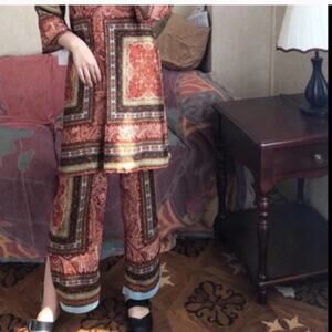 Pants have an elastic waist band and feature a paisley print in primarily rust orange color and blue color at hem. Pants have slits on the outer sides.