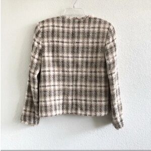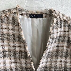 Zara Frayed Collarless V Neck Tweed Plaid Blazer