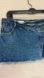 Trendy blue denim mini skirt with frayed hem. Asymmetrical front design. Ideal for casual wear.