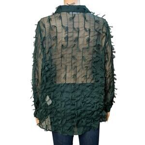 Zara Fringe Button Down Blouse Small Sheer Chiffon Dark Green Long Sleeve Goth