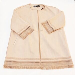 Zara Fringed Jacket Cardigan Textured Faux Suede Nude Pink Size L