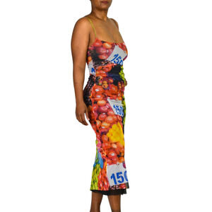 Zara dress FEATURES a slip dress silhouette with photorealistic fruit market print. Thin spaghetti straps. Side ruching. Side slit. Mesh fabric. Midi length. Bodycon silhouette.