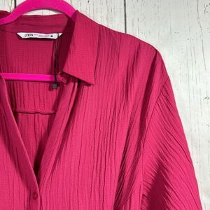 Eye-catching fuchsia pink shirt dress from Zara featuring a wrap-front silhouette with a belted waist tie for a flattering fit. Designed in a textured crinkle fabric with long sleeves, collared neckline, and button-front closure. Perfect styled as a mini dress with boots or layered as a tunic for versatile day-to-night looks.
