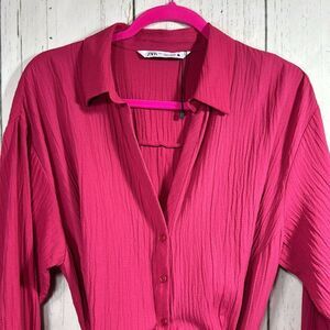 Zara Fuchsia Pink Belted Shirt Dress Crinkle Texture Wrap Style Modern Chic