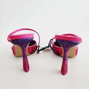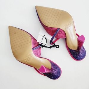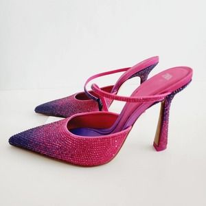 Chic Zara heels with a pointed toe. Features fuchsia and violet hues. Adorned with sparkling embellishments.