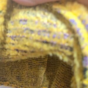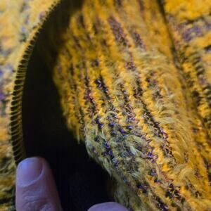 Bold plaid/check pattern in mustard yellow with purple and black accents