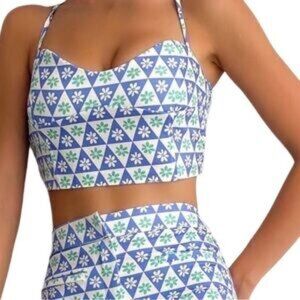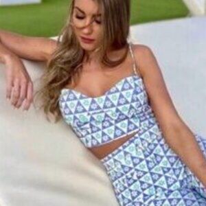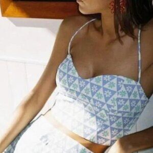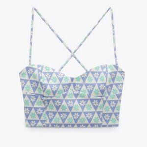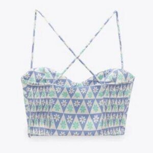 Zara geometric daisy print bodice style crop top with sweetheart neckline, spaghetti straps that crossover at the back, concealed side zipper and ruched elasticated back panel. Women's size small (US 4-6.) In excellent preowned condition, from a smoke-free, pet-free home.
