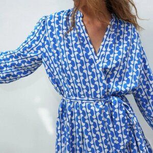 Zara Geometric Dress Long Sleeve Waist Tie Blue White Print Boho | Size XXL