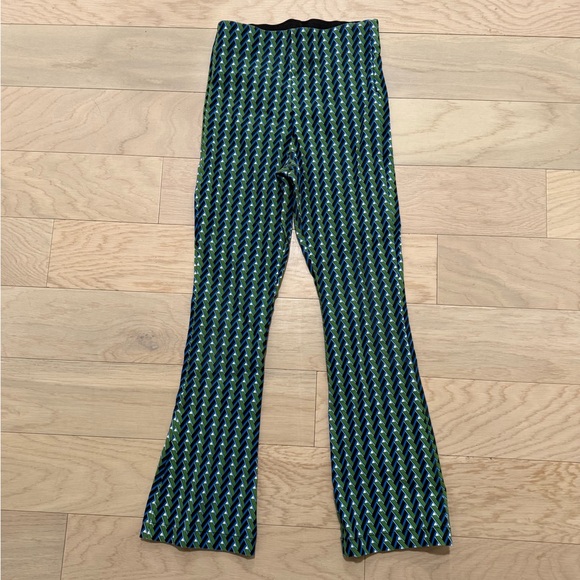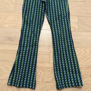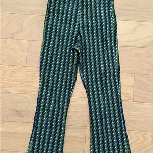 Pull on pants with elastic waist. Minor fading on butt. Cobalt blue and green pattern, perfect for adding a pop of color to any outfit. Comfortable and stylish, they are ideal for everyday wear. Flared ankle. Very good condition