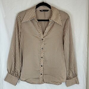 Keywords: Zara blouse, geometric print shirt, long sleeve top, button down blouse, womens medium blouse, retro print blouse, geometric pattern shirt, collared blouse, beige brown blouse, dress shirt, casual blouse, work blouse