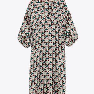 Stylish Zara midi dress with geometric print. Features green and pink patterns. Perfect for any occasion.