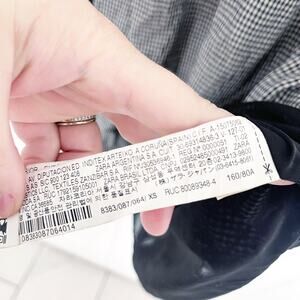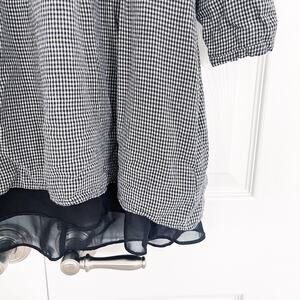 Small gingham print. Long sleeve. Lined. Detachable embroidered Peter Pan collar with contrasting chatreuse velvet tie. Lining that peeks out at the bottom length. Babydoll dress, tunic.