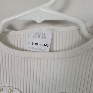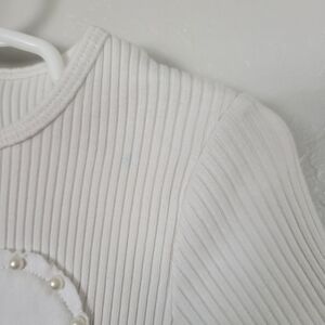Zara Girls 9-10 White Short Sleeve Ribbed Shirt Heart Applique Pearl Accent Tee
