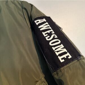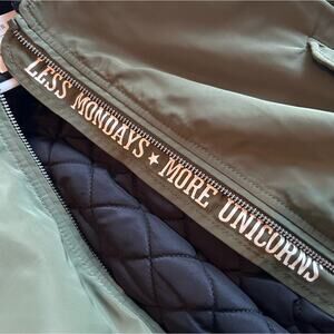 Trendy Zara bomber jacket in green and black, girls size 5. Features embroidered and printed details including "awesome" on the sleeve, star near the cuff, and fun sayings: "less Mondays * more unicorns" (inside zip) and "more unicorns" on the back. Zipper sleeve pocket adds extra flair. In great condition with minor fuzzies on collar, cuffs, and hem—easily fixable with a sweater shaver.