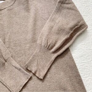 Tunic length knit sweater in taupe brown color. Gathered/ribbed sleeves and ribbed collar for comfortable warmth. Side seam slit on both sides.